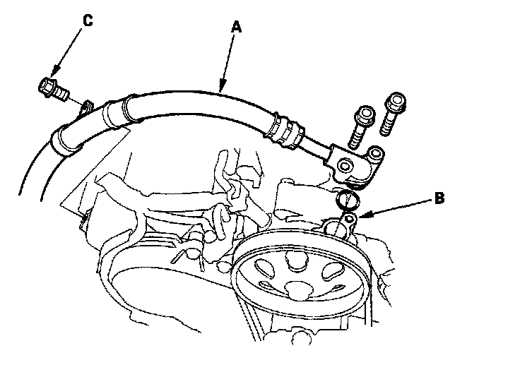 11. Remove the power steering pump outlet hose (A) at the pump (B), and remove the hose clamp bolt (C).