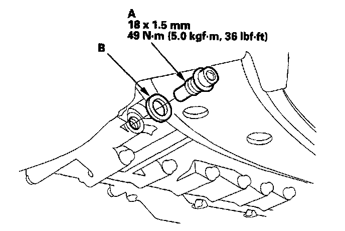 12. Raise the vehicle, and make sure it is securely supported. Remove the drain plug (A), and drain the automatic transmission fluid (ATF). Reinstall the drain plug with a new sealing washer (B).