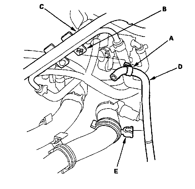 13. Remove the transmission breather tube clamp (A) from the clamp bracket (B) on the coolant pipe (C), and remove the breather tube (D) from its clamp (E) on the radiator hose,