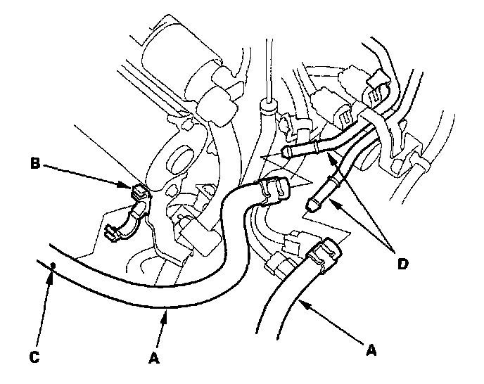 15. Remove the ATF cooler hoses (A) from the ATF cooler lines (D). Turn the ends of the ATF cooler hoses up to prevent ATF from flowing out, then plug the ATF cooler hoses and lines.