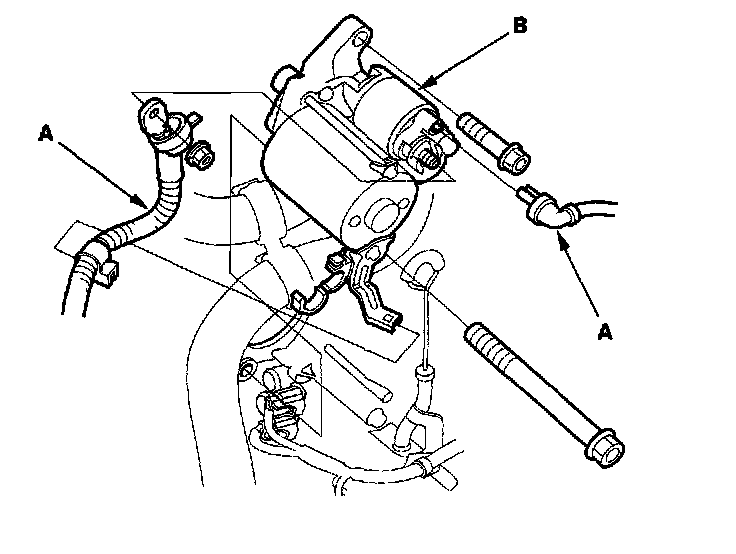 16. Remove the starter cables (A) from the starter (B), then remove the starter.