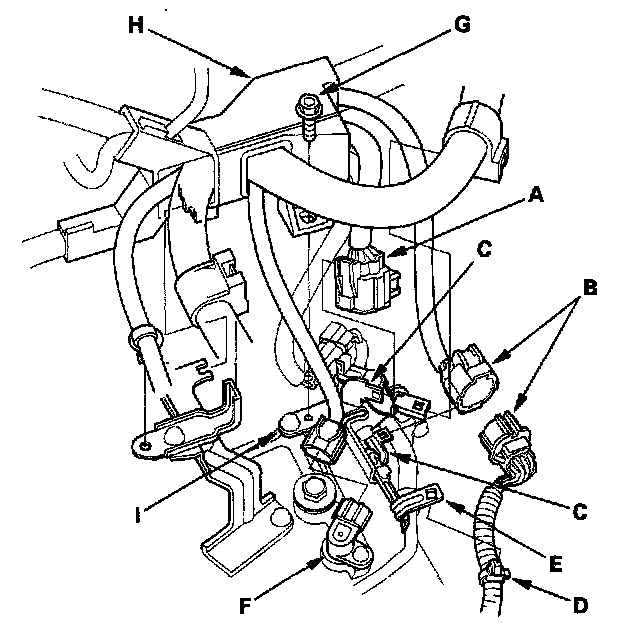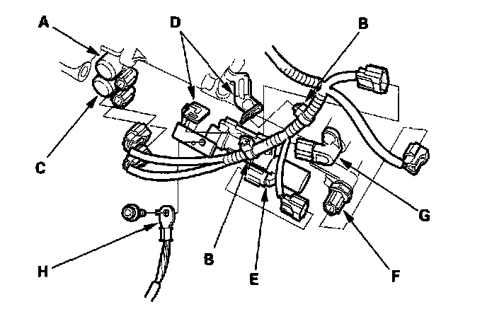 17. Remove the harness clips (B) from the brackets (D), then disconnect the connectors from the shift solenoid valves A and C, A/T clutch pressure control solenoid valve C (E), 4th clutch pressure switch (F), and mainshaft speed sensor (G).