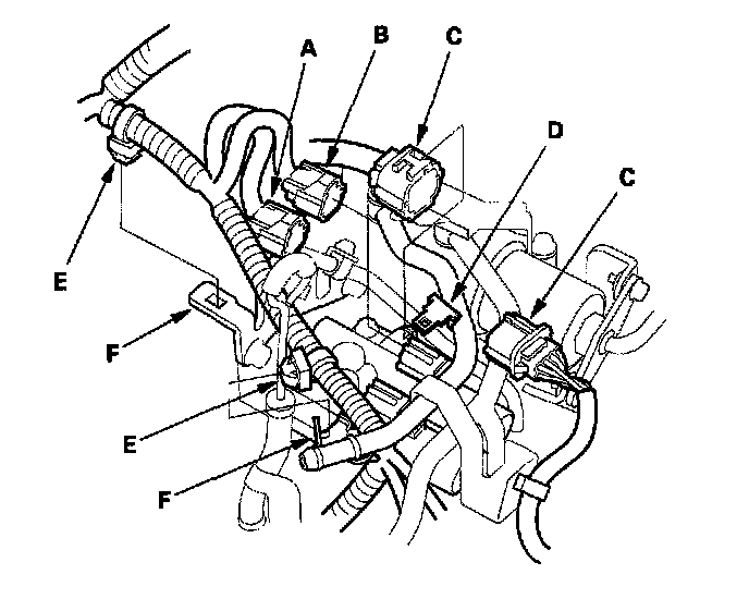 20. Remove the harness clips (E) from the brackets (F), then disconnect the connectors from the A/T clutch pressure control solenoid valves A and B.