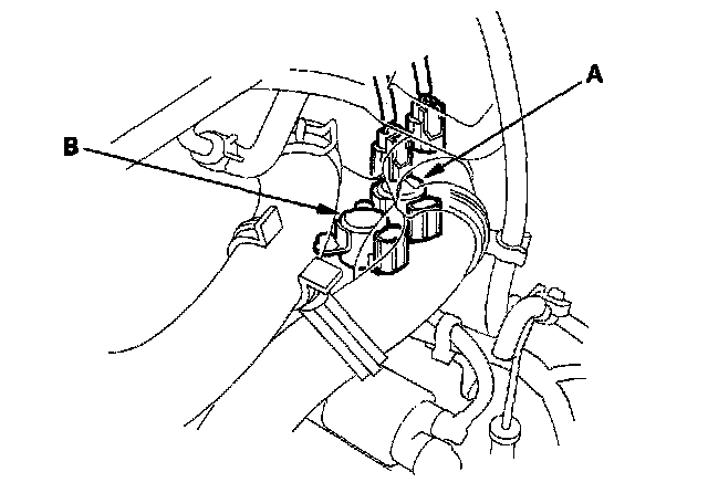 21. Disconnect the connectors from the torque converter clutch solenoid valve (A) and shift solenoid valve B.