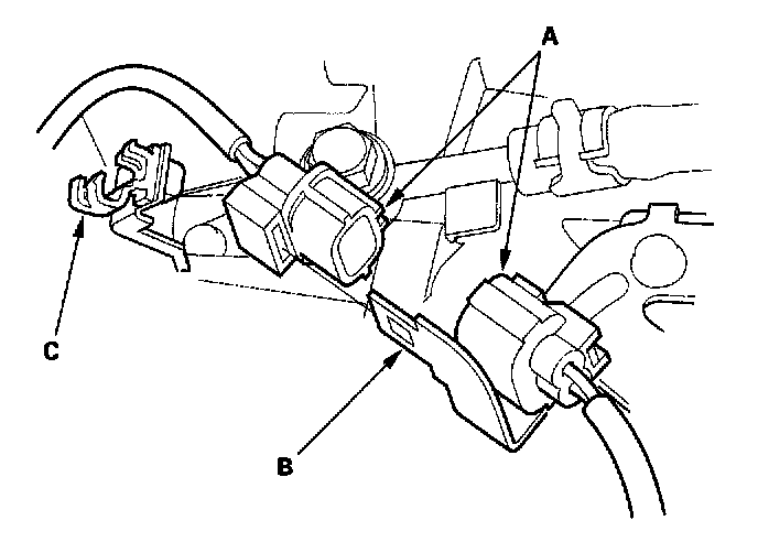 22. Remove the joint connector (A) and transmission range switch connector (B) from the connector brackets (C).