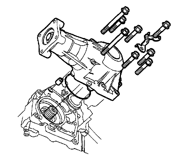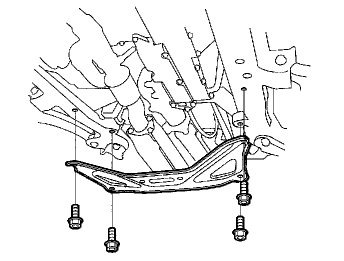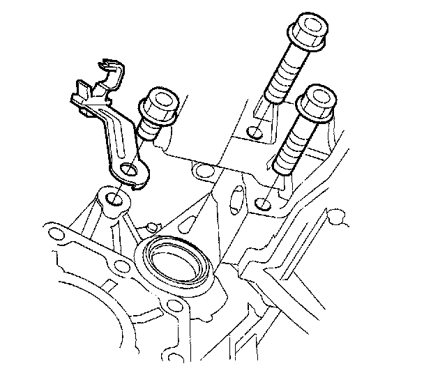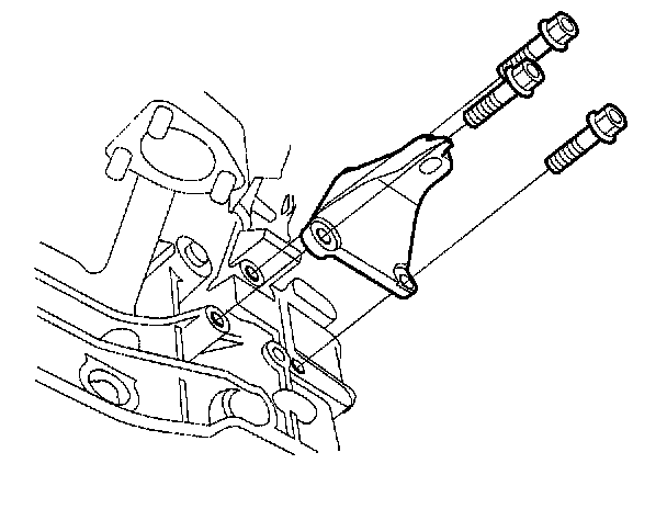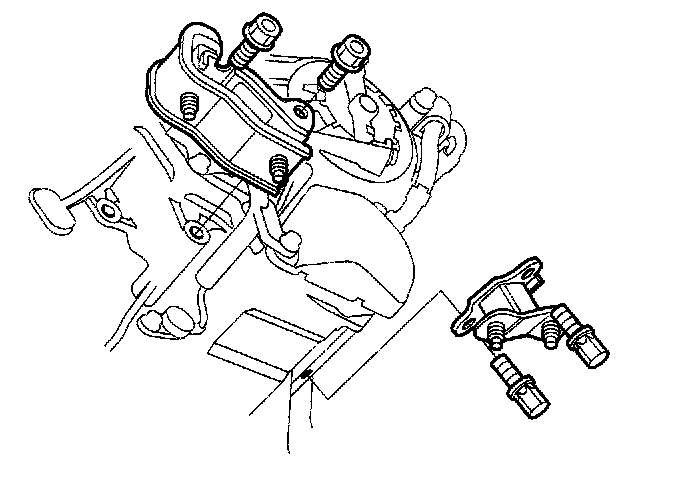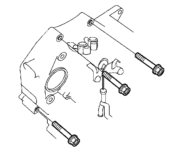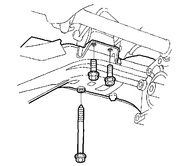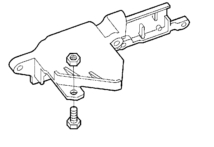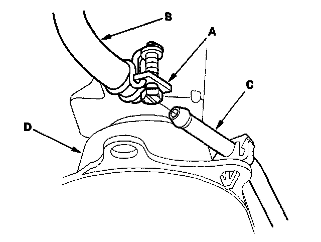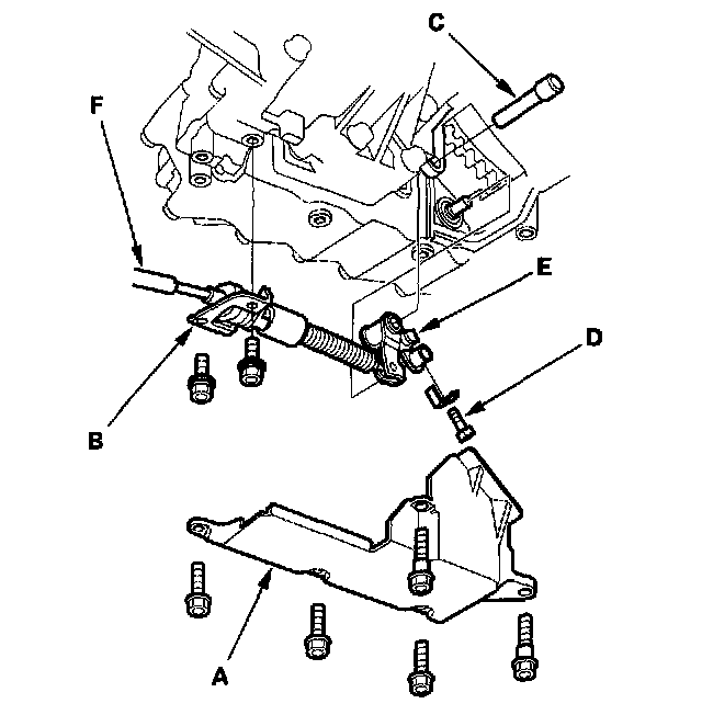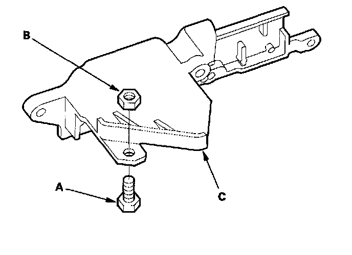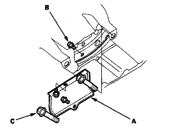 43. Install a 6 x 1.0 x 14 mm bolt (A) and nut (B) on the shift cable cover (C), then reinstall the shift cable cover to the torque converter housing. If you don't do this, the bolt head of the cable cover may prevent you from removing the torque converter during transmission removal.
