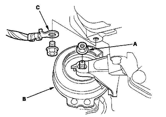 29. Remove the nut (A) from the front mount (B), and remove the ground cable (C) from the engine.
