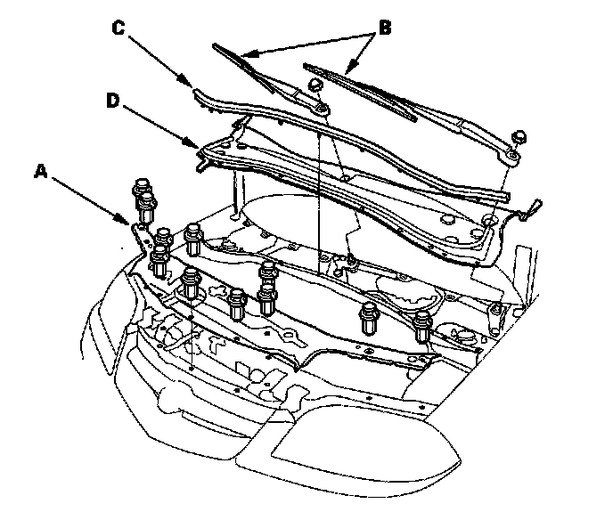 30. Remove the front bulkhead cover (A), windshield wiper arms (B), cowl cover sealing (C), and cowl cover (D).
