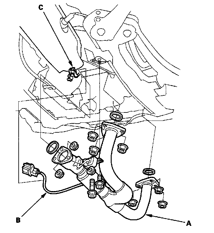 27. Disconnect the Primary H02S connector (A), and remove the Primary H02S harness from the harness clamp (C).