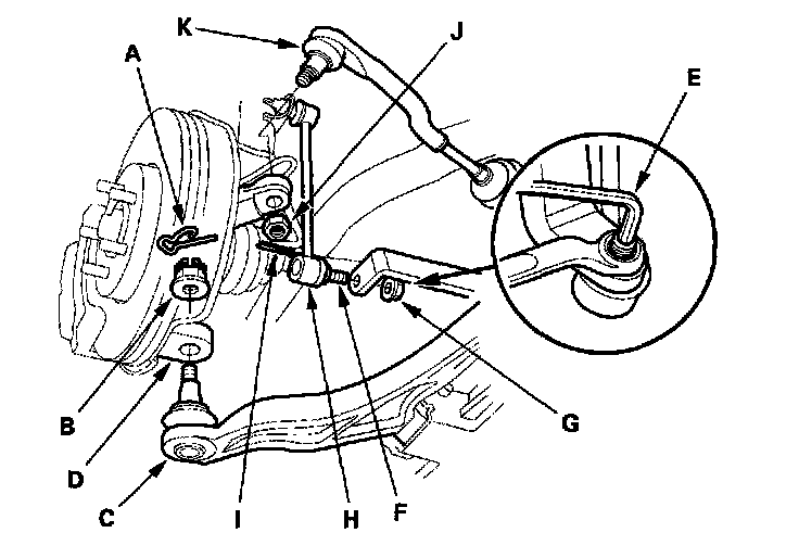 37. Insert a 6 mm Allen wrench (E) in the top of the ball joint pin (F), and remove the nut (G), then separate the stabilizer link (H).