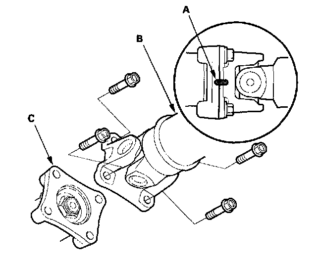 40. Make a reference mark (A) across the propeller shaft (B) and the transfer companion flange (C), then separate the propeller shaft from the companion flange.