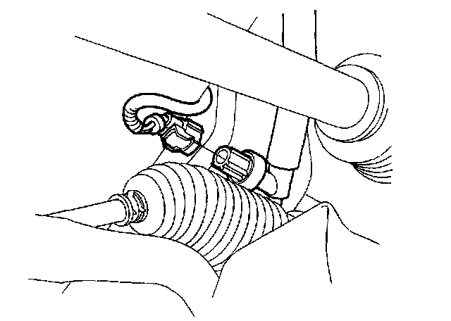14. Remove the cooler hose (A) from the clamp (B) on the starter, and paint a white dot (C) on the hose where it came off the clamp if the white dot is not painted.