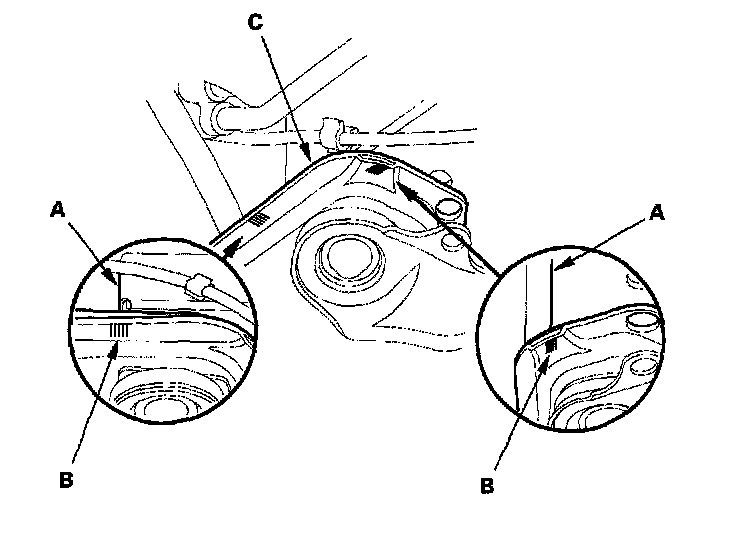 50. Make reference marks (A) on the body across the marks (B) on the edge of the front sub-frame (C).