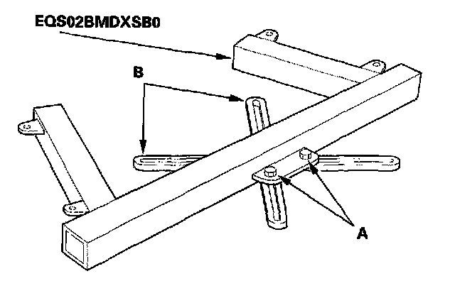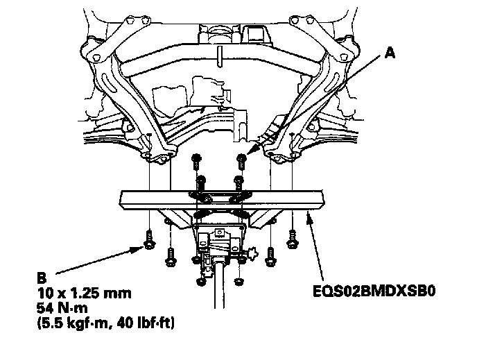 52. Loosen the four bolts (A) holding the adjustable arms (B) of the front sub-frame adapter (T/N EQS02BMDXB0) to its center plate.
