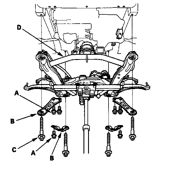 55. Remove the 12 X 1.25 mm bolts (6) (A) securing the sub-frame stiffeners (B), the four sub-frame mounting bolts (C), and the stiffeners, then lower the front sub-frame (D).