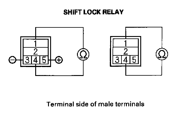 9. Check for continuity between the No. 1 and No. 4 terminals of the shift lock relay while connecting the battery positive terminal to the No. 5 terminal of the shift lock relay, and connecting the negative terminal to the No. 3 terminal.