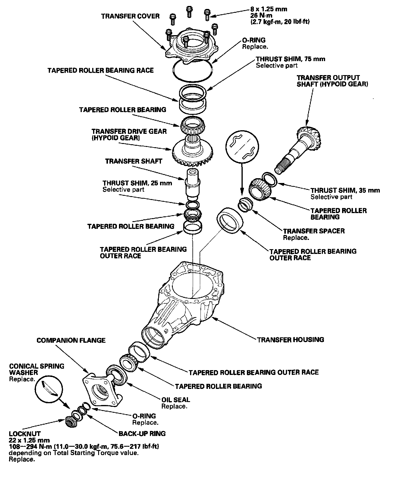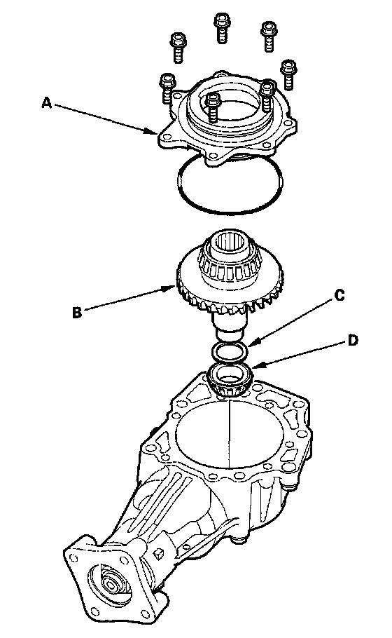 2. Remove the transfer drive gear/shaft assembly (B), 25 mm thrust shim (C), and tapered roller bearing (D).
