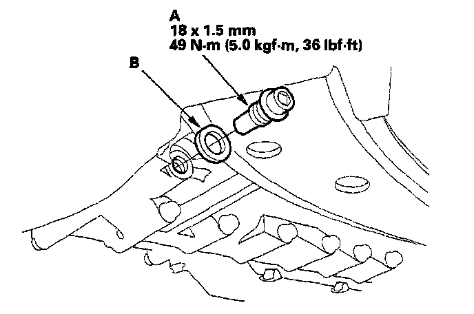 2. Remove the drain plug (A), and drain the automatic transmission fluid (ATF). Reinstall the drain plug with a now sealing washer (B).