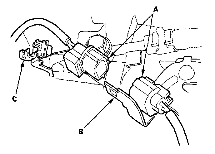 4. Disconnect the Primary H02S connector (A), and remove the harness from the harness clamp (C).