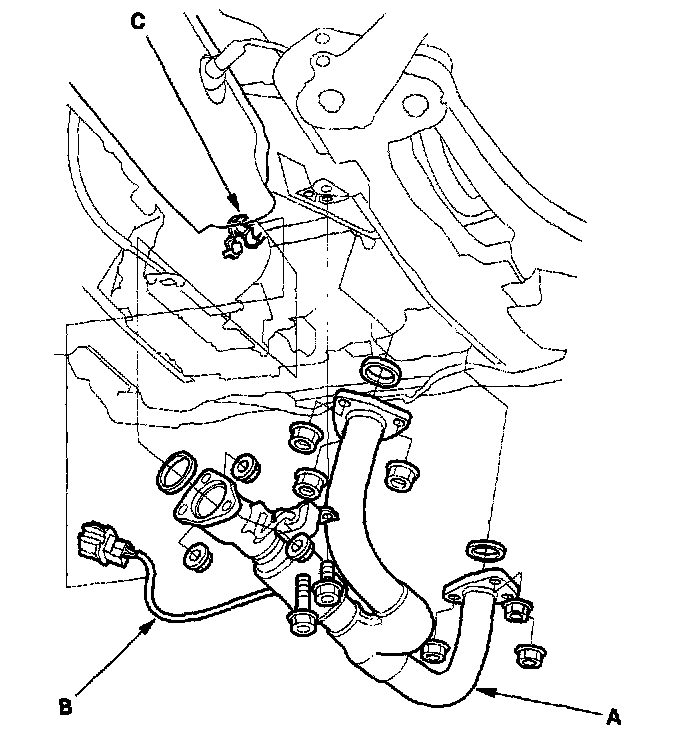 6. Remove the Primary H02S harness (B) from the clamp (C) on the transfer mounting bolt.