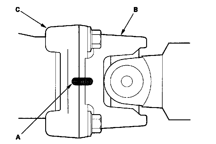 8. Make a reference mark (A) across the propeller shaft (B) and the transfer companion flange (C).