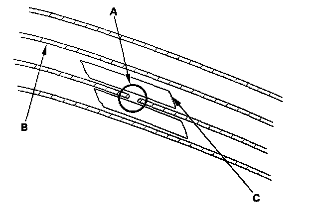 2. Carefully mask above and below the broken portion of the defogger wire (B) with cellophane tape (C).