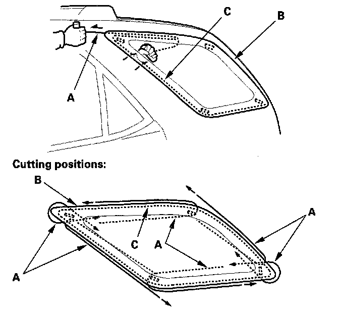 5. With a helper on the outside, pull the piano wire (A) back and forth in a sawing motion. Hold the piano wire as close to the quarter glass (B) as possible to prevent damage to the body, and carefully cut through the adhesive (C) around the entire quarter glass.