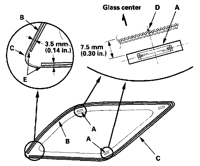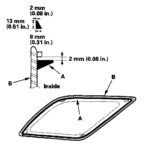 18. Pack adhesive into the cartridge without air pockets to ensure continuous delivery. Put the cartridge in a caulking gun, and run a bead of adhesive (A) around the edge of the glass (B) as shown. Apply the adhesive within 30 minutes after applying the glass primer. Make a slightly thicker bead at each corner.