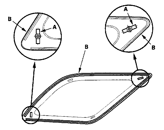 12. Set the quarter glass (A) in the opening, and center it. While you are holding the quarter glass on the outside, have an assistant make alignment marks on the glass with a grease pencil through the body holes (B) from inside the vehicle. Be careful not to touch the quarter glass where adhesive will be applied.