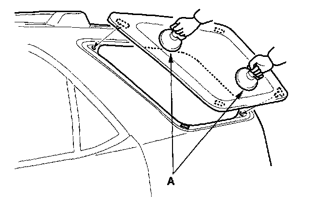 19. Use suction cups (A) to hold the quarter glass over the opening, align it and set it down on the adhesive. Lightly push on the quarter glass until its edges are fully seated on the adhesive all the way around. Do not open or close the doors until the adhesive is dry.