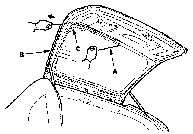 17. Pack adhesive into the cartridge without air pockets to ensure continuous delivery. Put the cartridge in a caulking gun, and run a bead of adhesive (A) on the glass primer trace (B) you applied on step 14, and around the edge of the rear window (C) as shown. Apply the adhesive within 30 minutes after applying the glass primer. Make a slightly thicker bead at each corner.