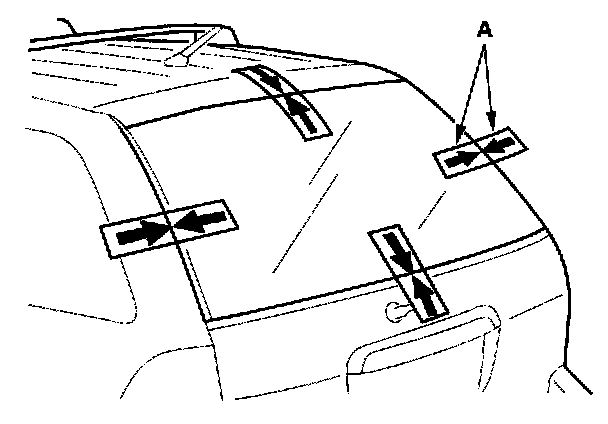 12. Set the rear window in the opening, and center it. Make alignment marks (A) across the rear window, tailgate, and body with a grease pencil at the four points shown. Be careful not to touch the rear window where adhesive will be applied.