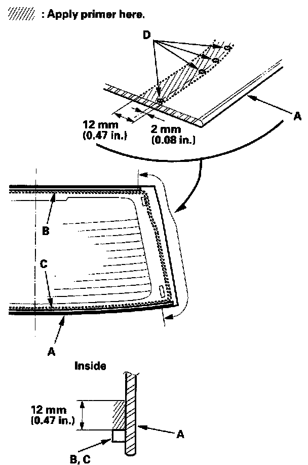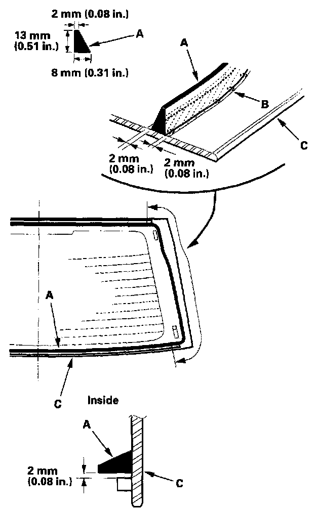 14. With a sponge, apply a light coat of glass primer to the edge of the rear window (A) along the upper rubber dam (B) and lower rubber dam (C) as shown, then lightly wipe it off with gauze or cheesecloth: