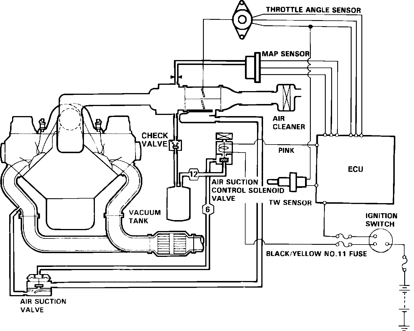 This system, Fig. 1, is designed to improve emissions performance by supplying fresh air from the air cleaner into the exhaust manifold, through the air suction valve.