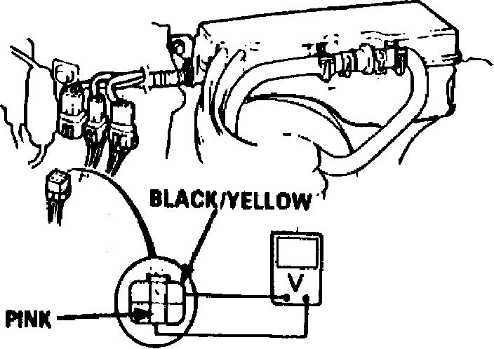 7. Disconnect 6 pin connector in engine compartment, then connect voltmeter positive lead to black/yellow wire terminal and negative lead to Pink wire terminal.