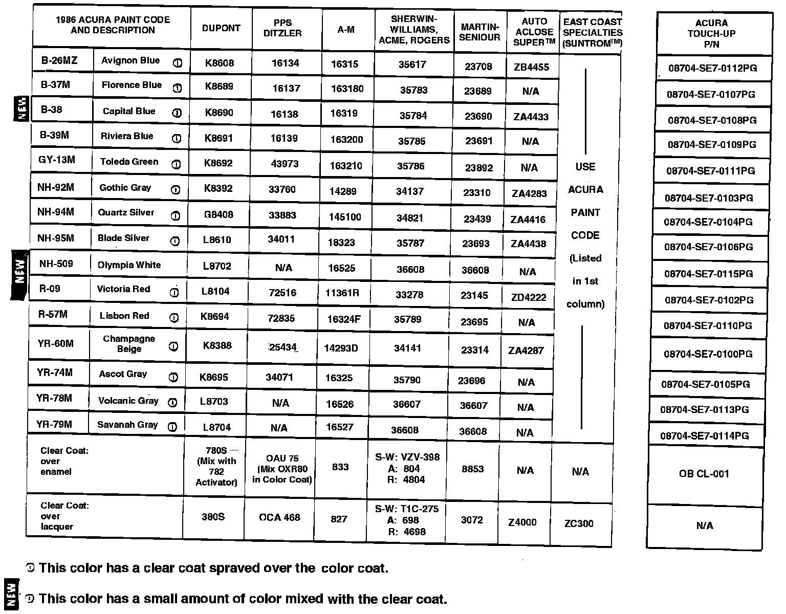 1986 Acura Paint Codes (Supersedes 86-004, dated June 16, 1986)
