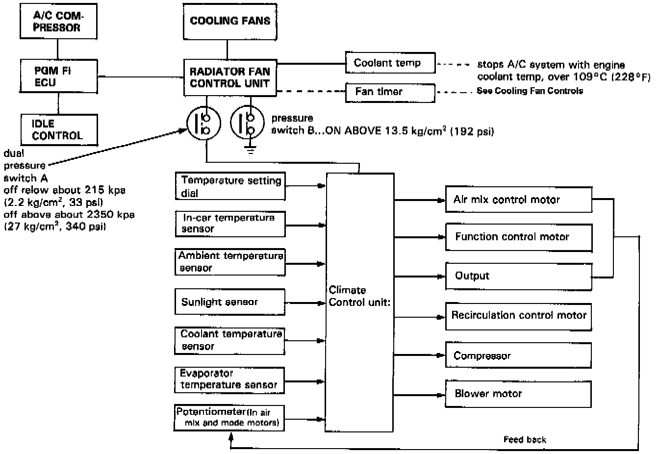 The climate control unit receives the input data sent by the sensors, the temperature setting dial and the potentiometers to decide the outlet air temperature, volume and direction.