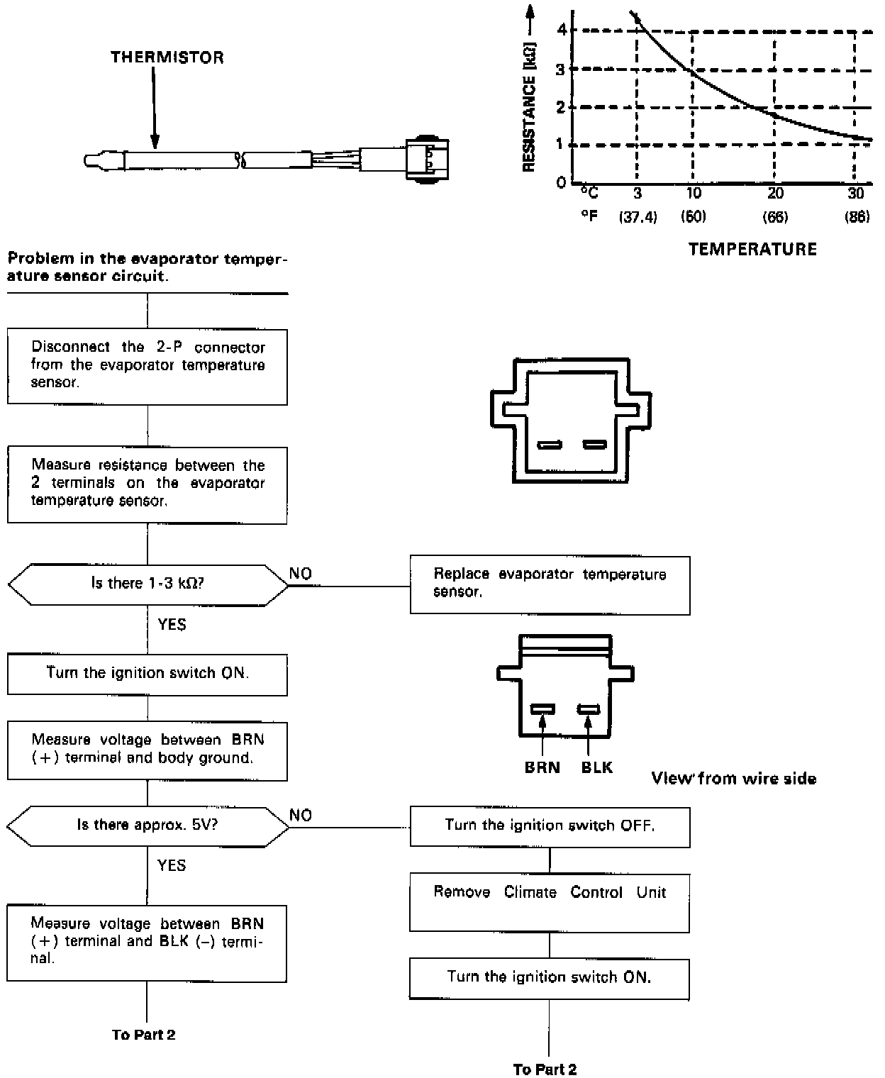 The evaporator temperature sensor is a temperature dependant resistor (thermistor). The resistance of the thermistor decreases as the evaporator outlet air temperature increases, as shown.
