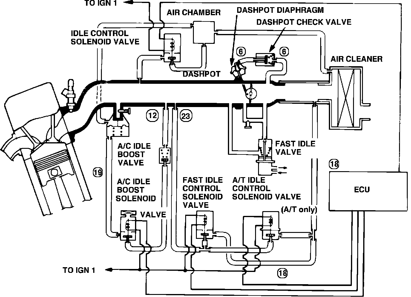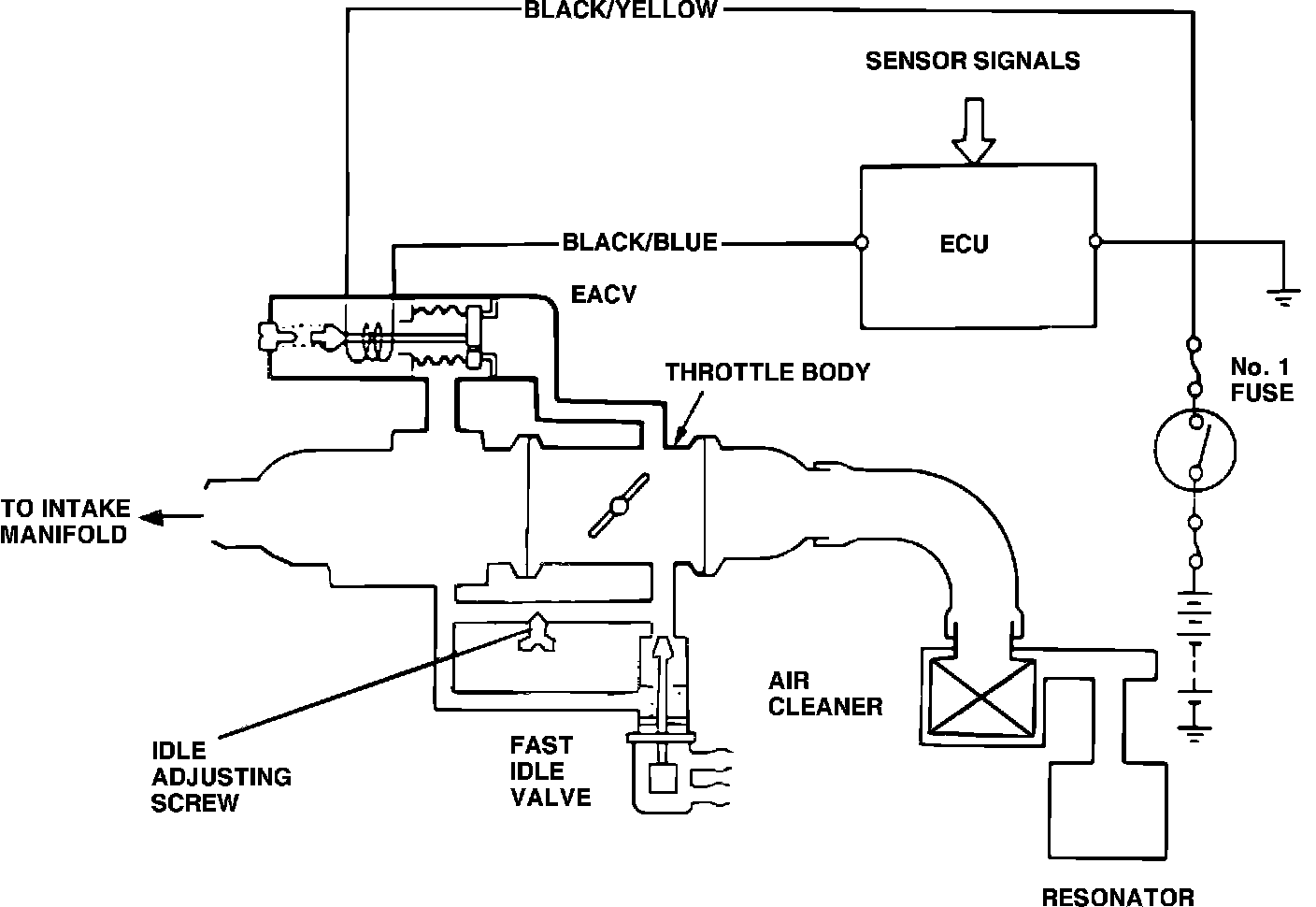 This system supplies air during engine operation and consists of the air cleaner, air intake pipe, throttle body, an electronic idle control valve (EICV), a fast idle bypass valve and an intake manifold. The EICV and fast idle bypass valve are also part of the Idle Control System.