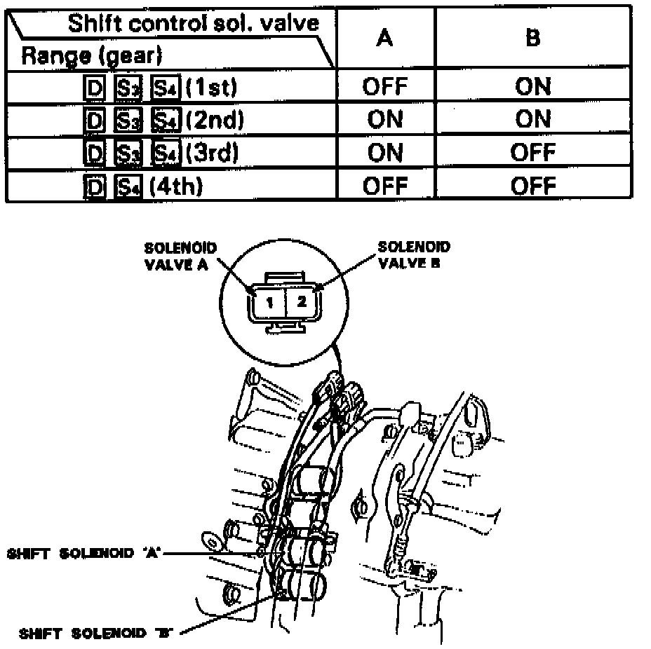 To do this you'll want to energize the shift solenoids with + 12V for each gear. Use the chart below to shift the transaxle.