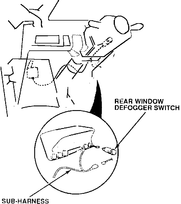 6. Push the rear defogger switch out through the dash, then unplug its connector. Plug the female connector of the sub-harness into the switch. Plug the male connector of the sub harness into the female switch connector.