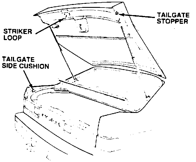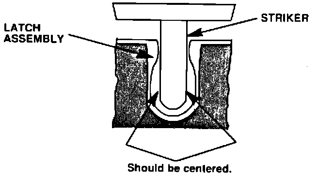 1. Clean any dirt and grease off the striker loop and examine the loop for evidence of contact with the metal part of the latch assembly. If properly adjusted, the loop should ride against the plastic pads in the latch assembly and show little or no wear. If metal-tometal contact is suspected, remove the rear trim panel for access to the latch assembly. Otherwise, apply a small dab of multipurpose grease to the striker loop and go to step 3.