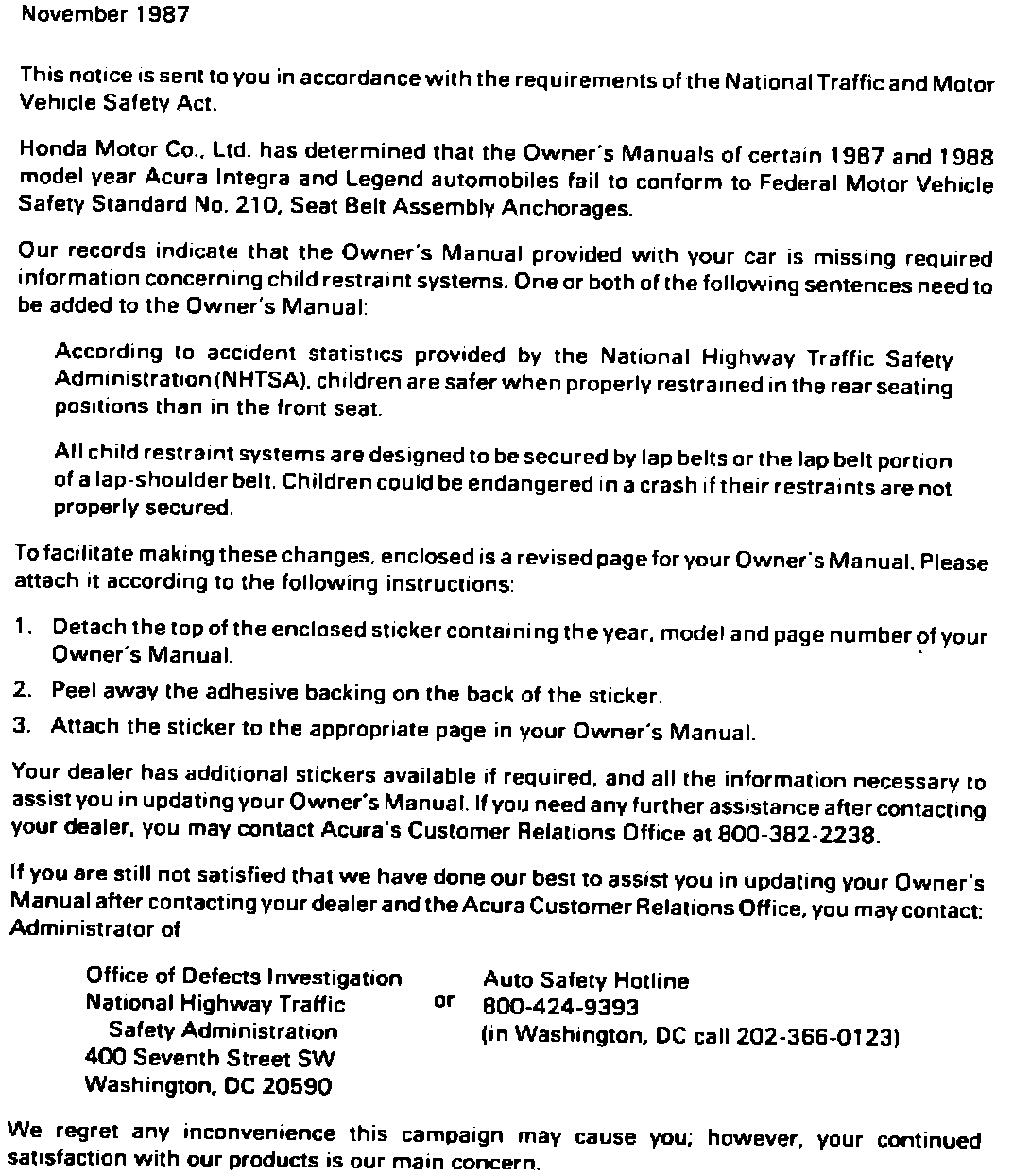 Honda Motor Co. Ltd has determined that a noncompliance with Federal Motor Vehicle Safety Standard No. 210. Seat Belt Assembly Anchorages, exists in the Owner's Manuals of certain 1987 and 1988 model year Acura automobiles. These Owner's Manuals are missing required information concerning child restraints.