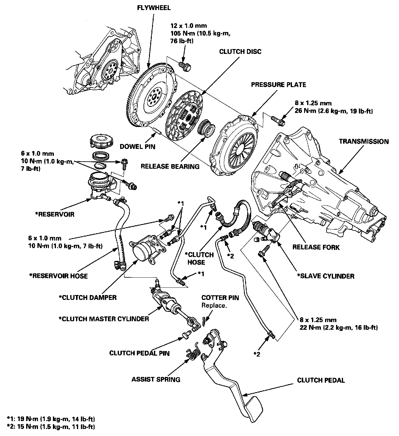 - If the parts marked * are removed, the clutch hydraulic system must be bled.