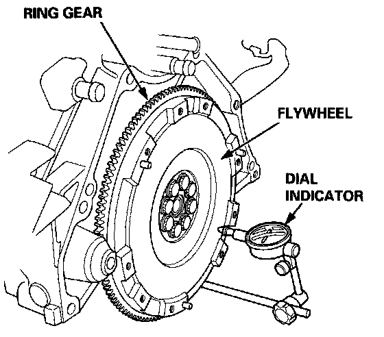 3. Measure the flywheel runout using a dial indicator through at least two full turns. Push against the flywheel each time you turn it to take up the crankshaft thrust washer clearance.