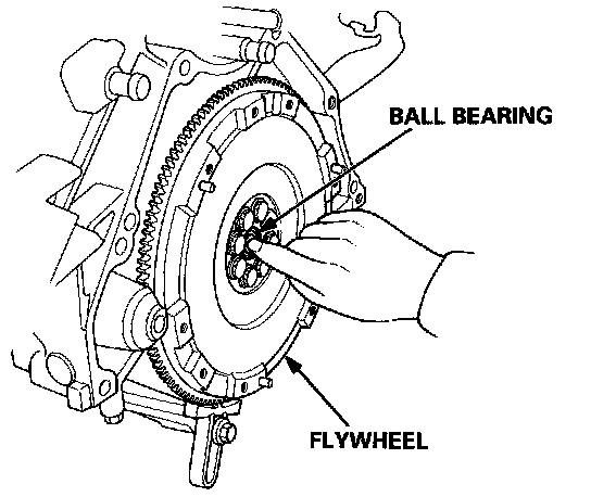 4. Turn the inner race of the ball bearing with your finger. The ball bearing should turn smoothly and quietly. Check that the ball bearing outer race fits tightly in the flywheel. Replace the ball bearing if the inner race does not turn smoothly, quietly, and fit tightly in the flywheel.