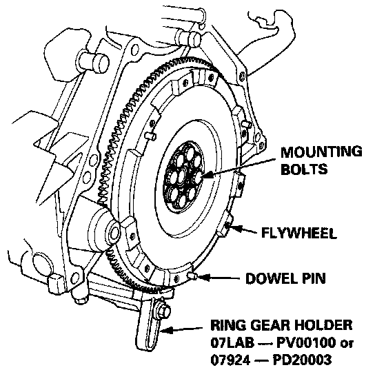 2. Remove the flywheel mounting bolts in a crisscross pattern in several steps, and remove the flywheel.