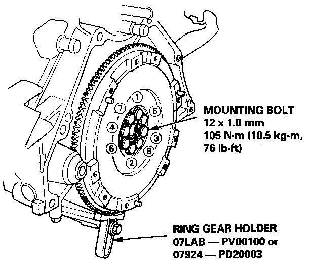 6. Install the special tool, then torque the flywheel mounting bolts in a crisscross pattern in several steps as shown.