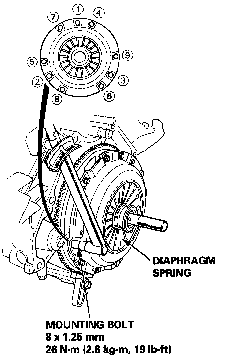 5. Torque the mounting bolts in a crisscross pattern as shown. Tighten the bolts in several steps to prevent warping the diaphragm spring.