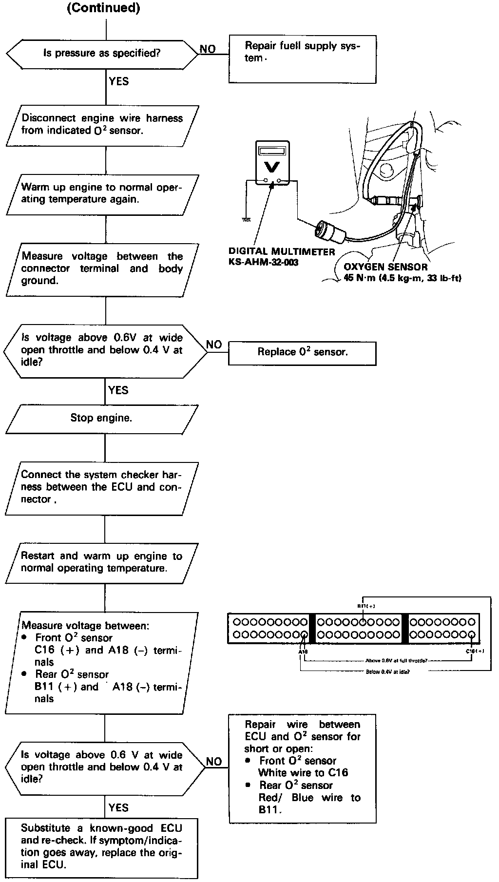 The oxygen sensor, detects the oxygen content in the exhaust gas, and inputs the ECU. In operation, the ECU receives the signals from the sensor and varies the duration during which fuel is injected. The oxygen sensors are installed on the exhaust manifolds.
